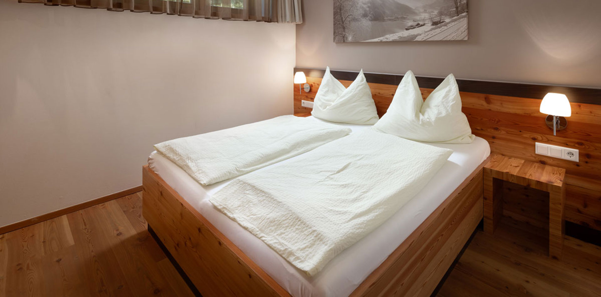 Das Doppelschlafzimmer "Körndlhorn" ist durch eine Verbindungstüre mit der "Sonnwendkogel"-Ferienwohnung verbunden.