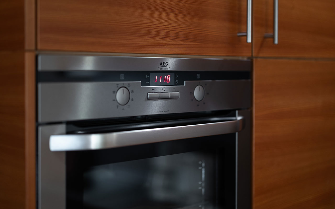 Küchen mit Geschirr, E-Herd, Backrohr, Kaffeemaschine, Kühlschrank und Geschirrspüler