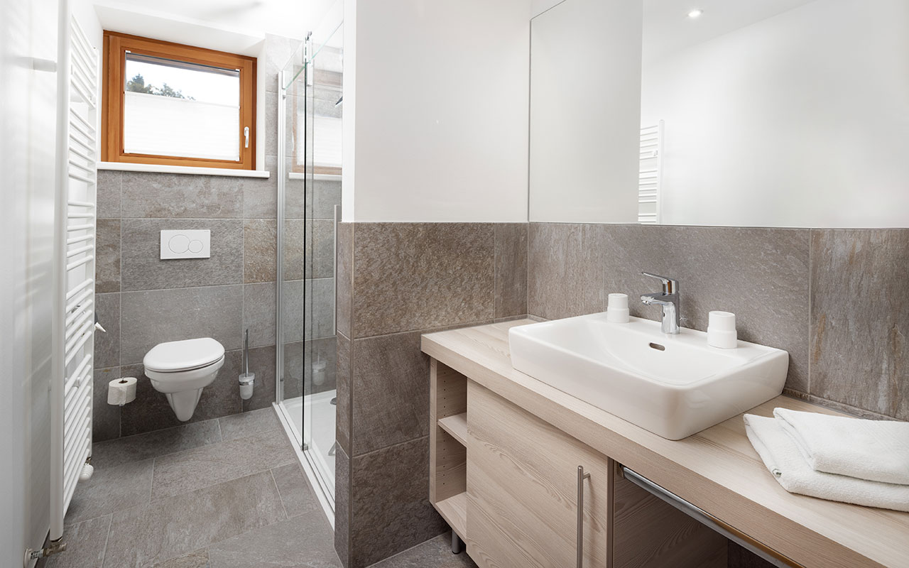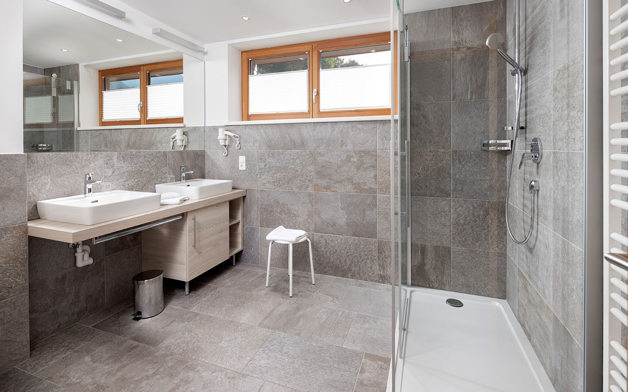 1 x Bad mit Dusche und WC (Bei einer Belegung ab 5 Personen kommt das Doppelzimmer mit Bad / WC dazu)