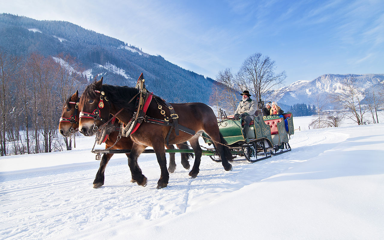 Eingehüllt in eine märchenhafte Winterlandschaft mit funkelnden Berggipfeln, schneebedeckten Wäldern und idyllisch gelegenen Dörfern, fahren Sie in einer Pferdekutsche durch den Schnee. Behaglich unter warmen Decken verbringen Sie unvergessliche Momente mit Ihren Liebsten und lauschen dem sanften Klang der Pferdeglocken. Eine romantische Auszeit für Ihren Winterurlaub im Pinzgau!